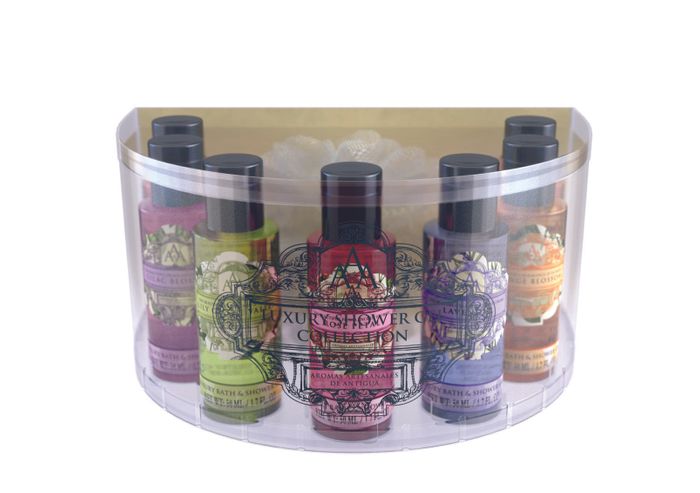 Aromas Artesanales De Antigua (AAA) Luxury Shower Gel Collection offers 7 mini floral shower gels and a shower puff.