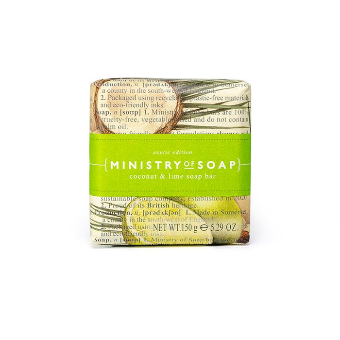 Ministry of Soap is made in Somerset, using ethically sourced sustainable (RSPO certified) palm oil. This naturally coloured triple-milled soap bar is blended with the delicious scents of coconut and lime. The natural design combines fruity prints with vibrant highlights.
